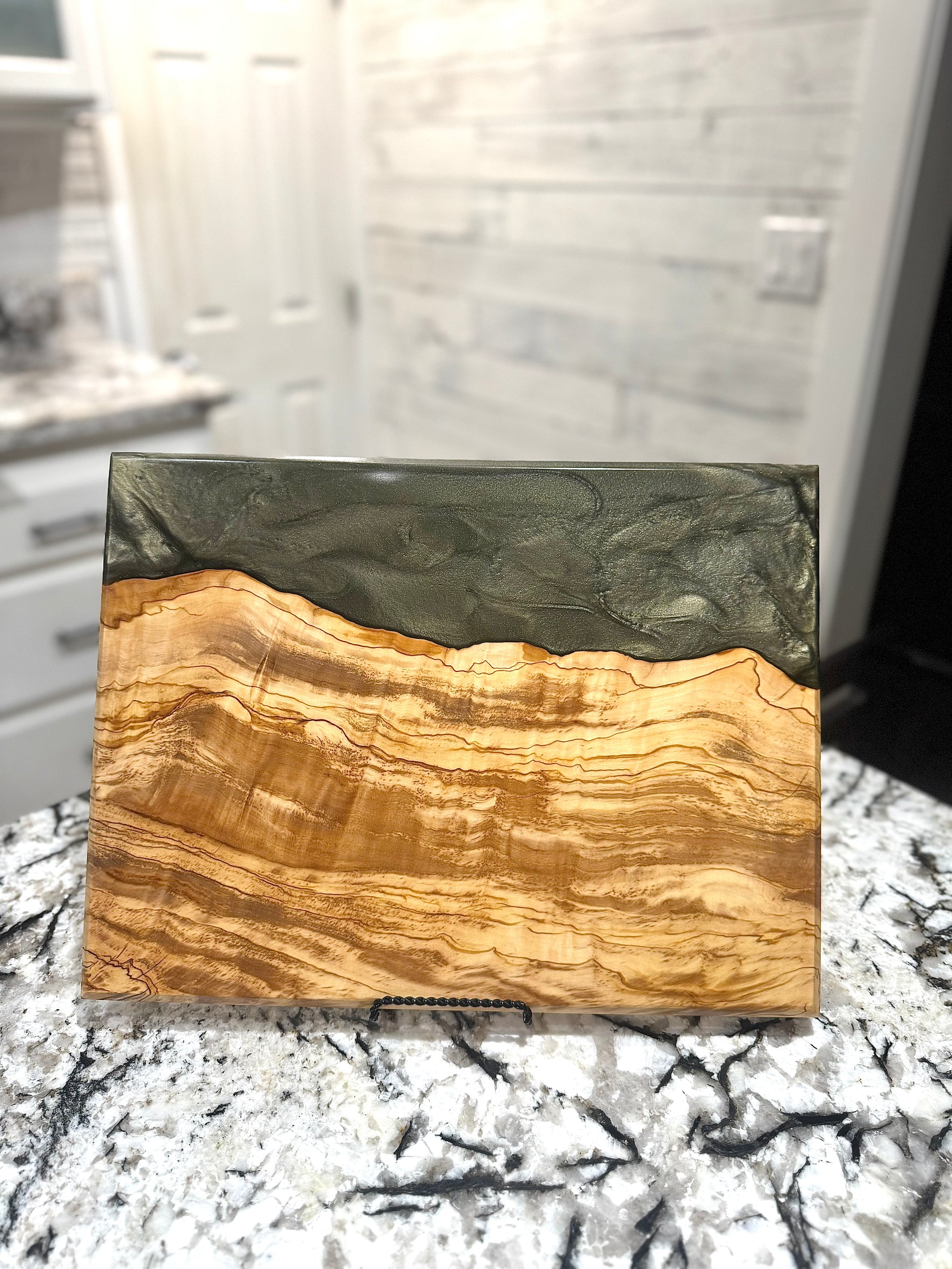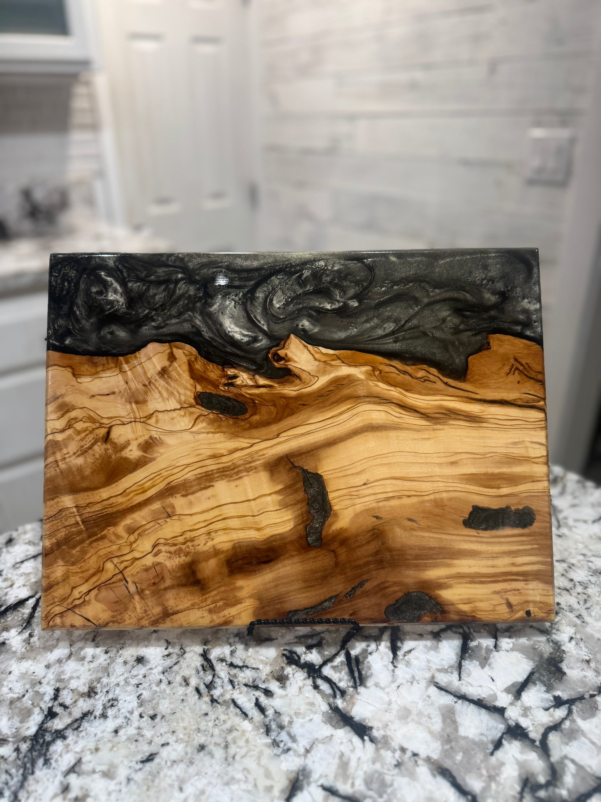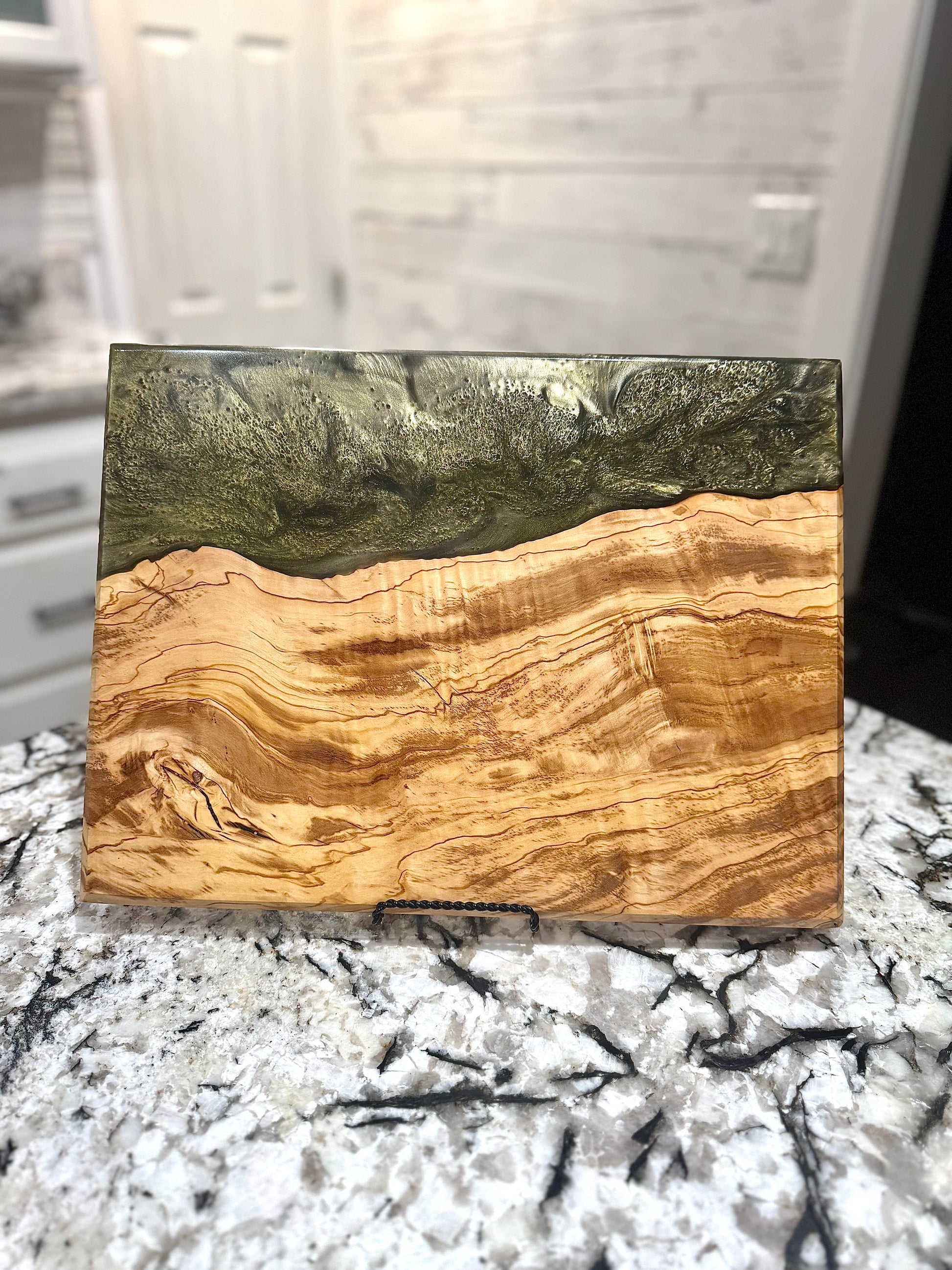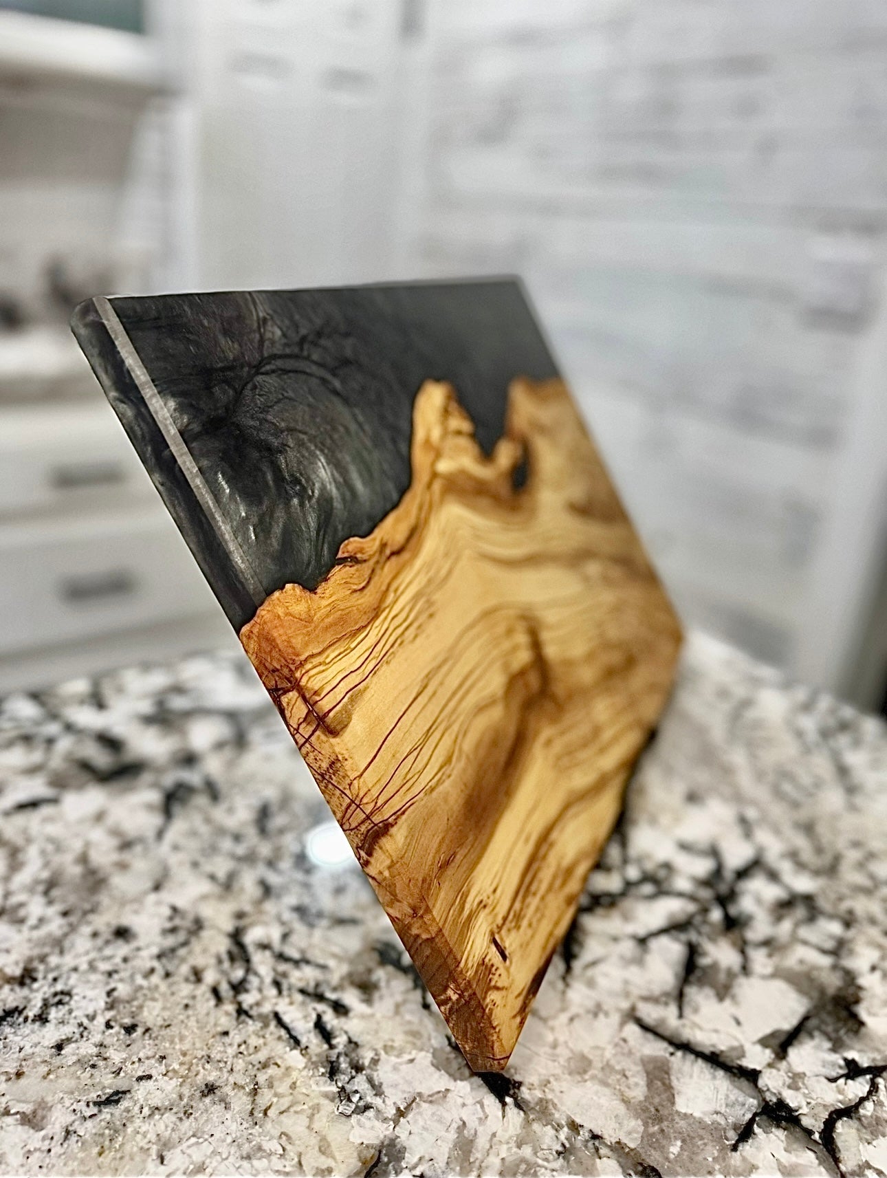Offering Eastern Olive and Epoxy Serving Boards for a special occasion or daily use. These boards show off their elegant beauty with epoxy swirls along side.