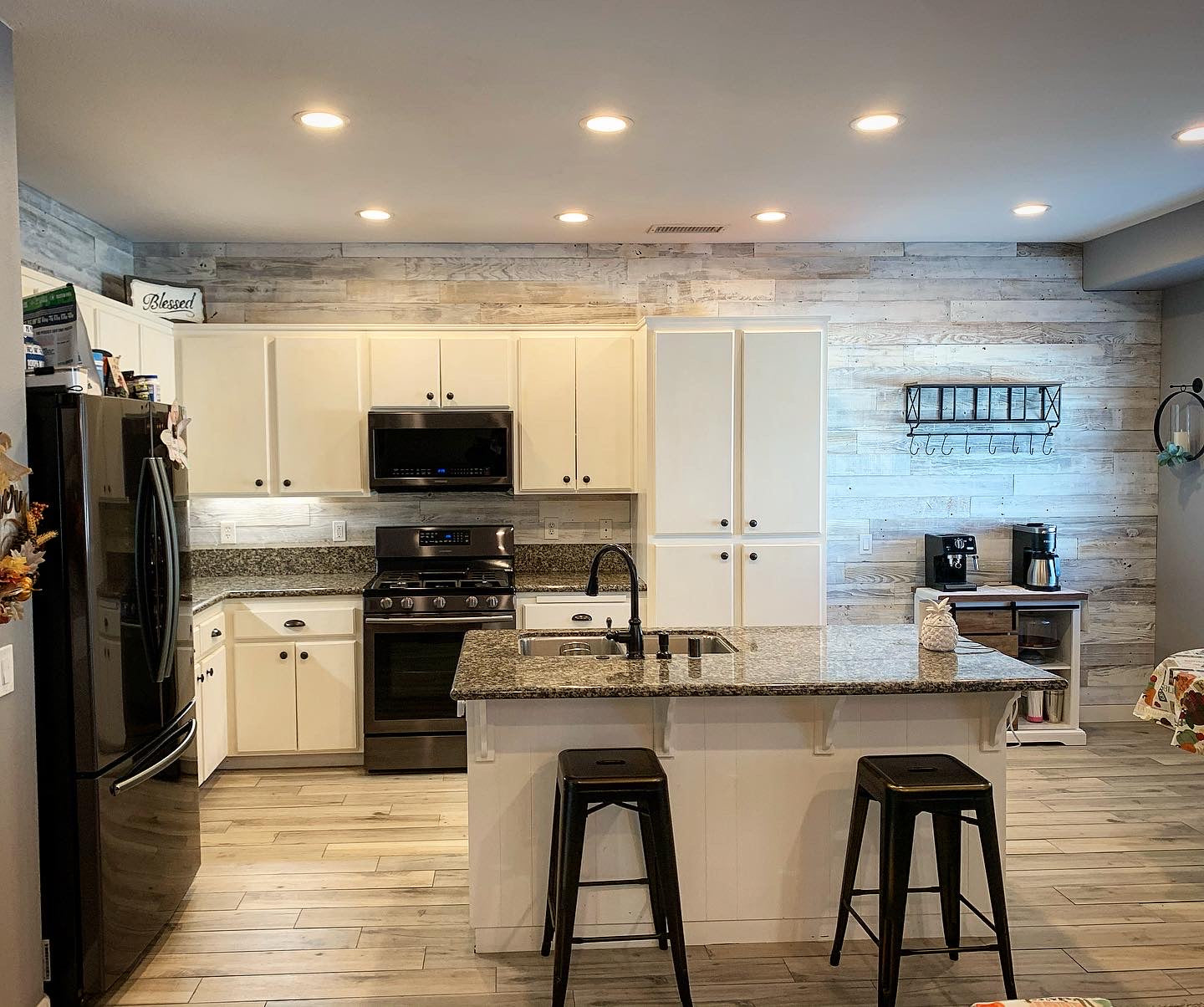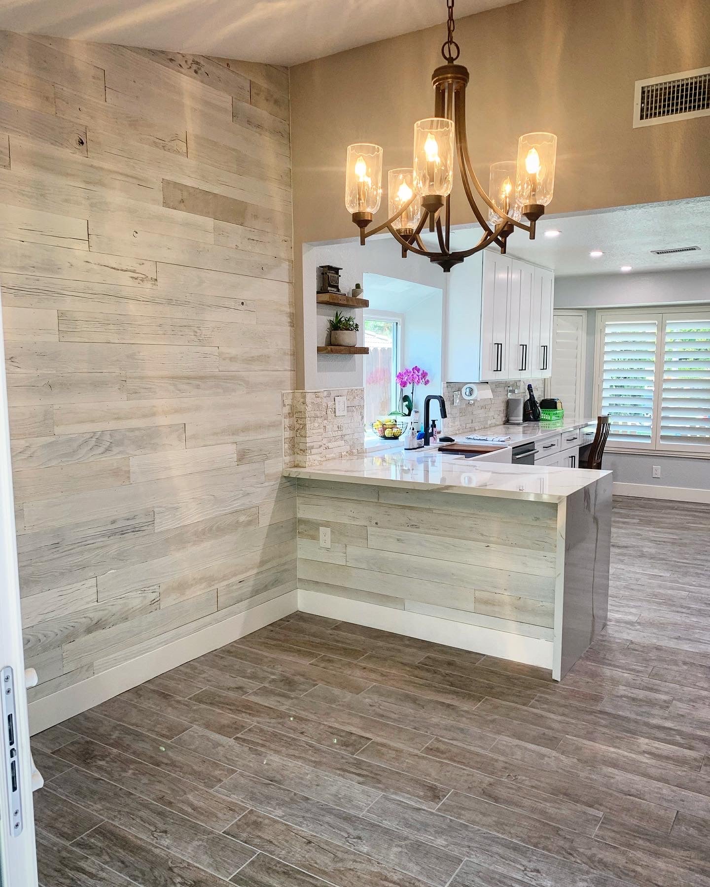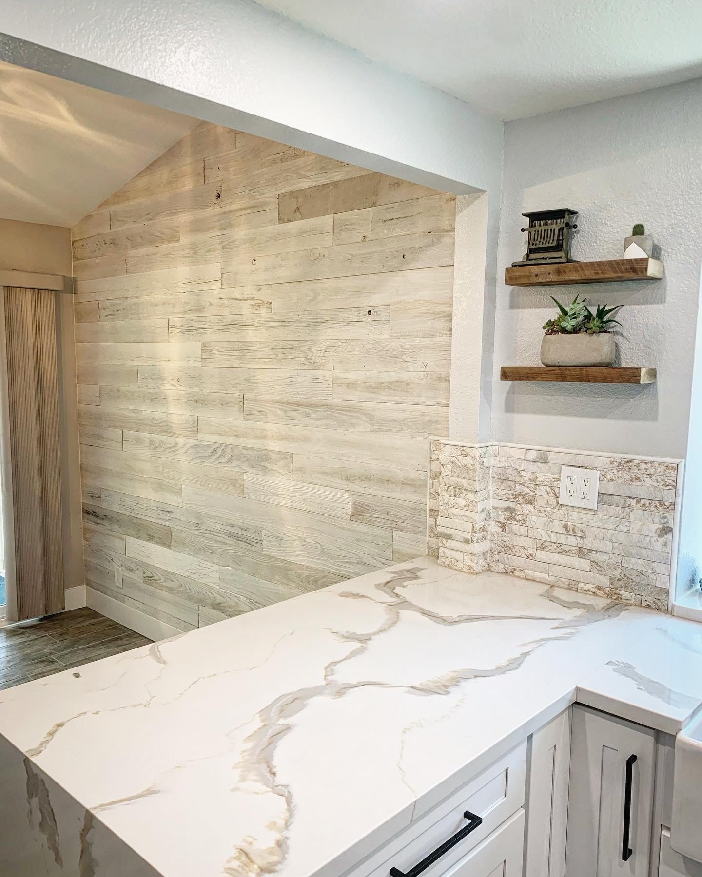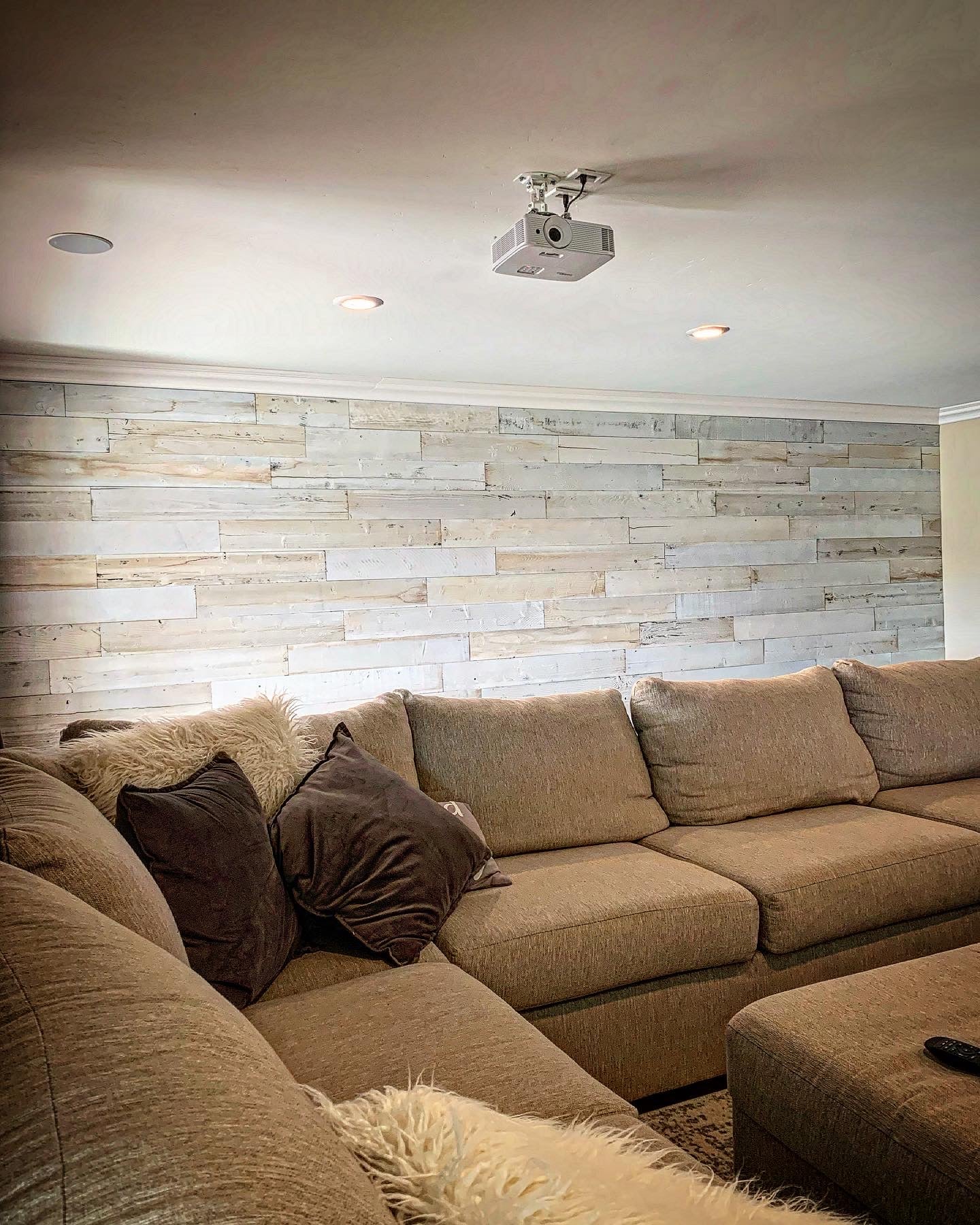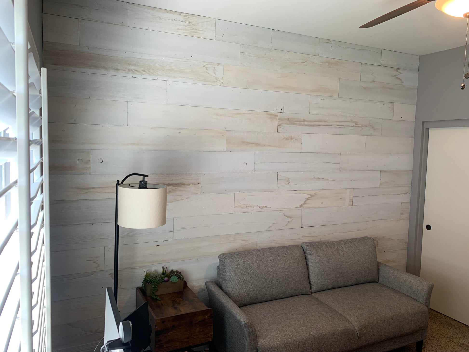 If you're looking for a cozy cabin-like feel in your living room or want to add warmth and texture in your bedroom, this white-washed reclaimed wood paneling is perfect. It's great for creating accent walls or unique furniture pieces like headboards or coffee tables.